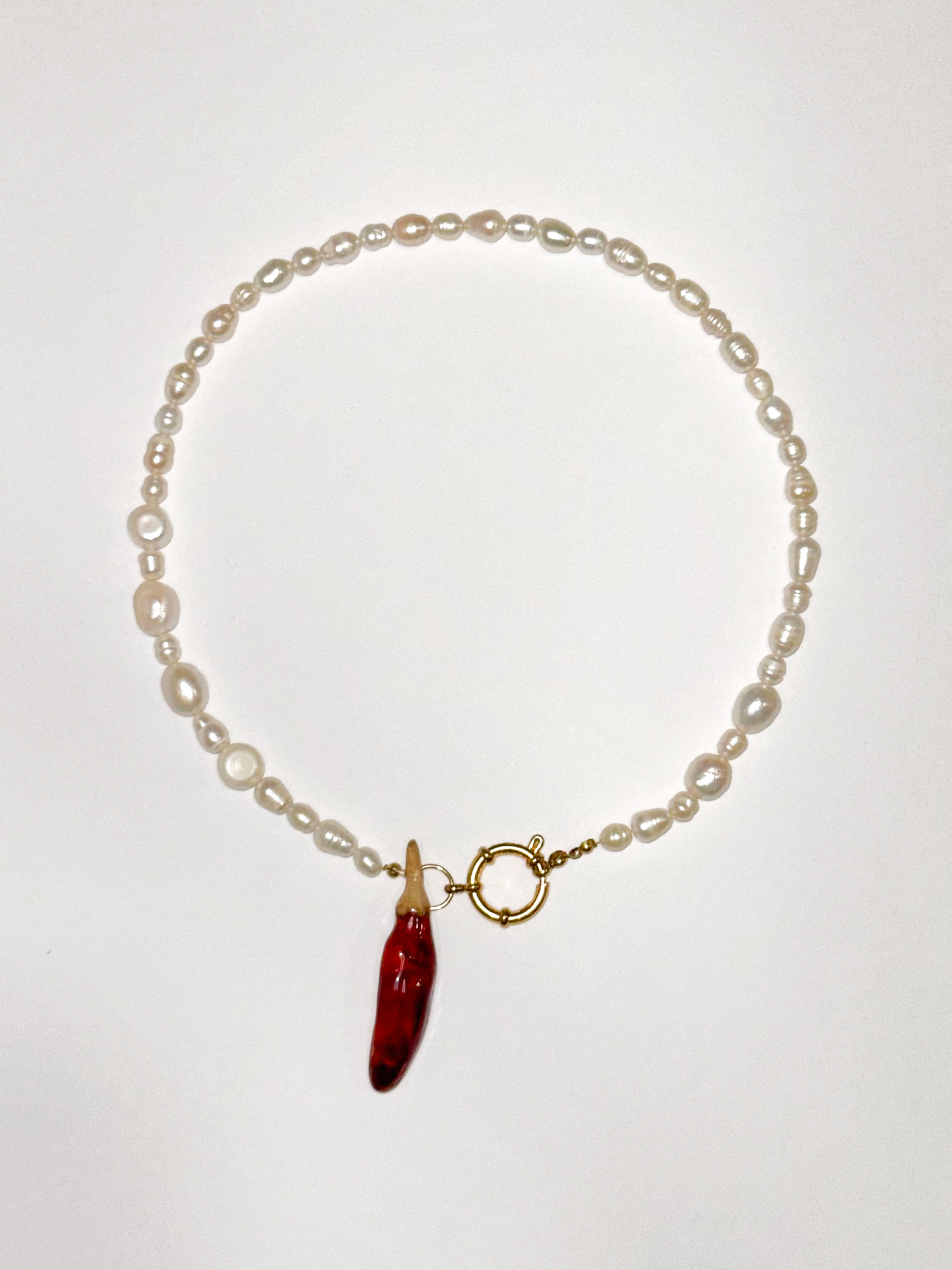 River pearl necklace with dried chili pepper pendant wrapped in resin and stainless steel components.