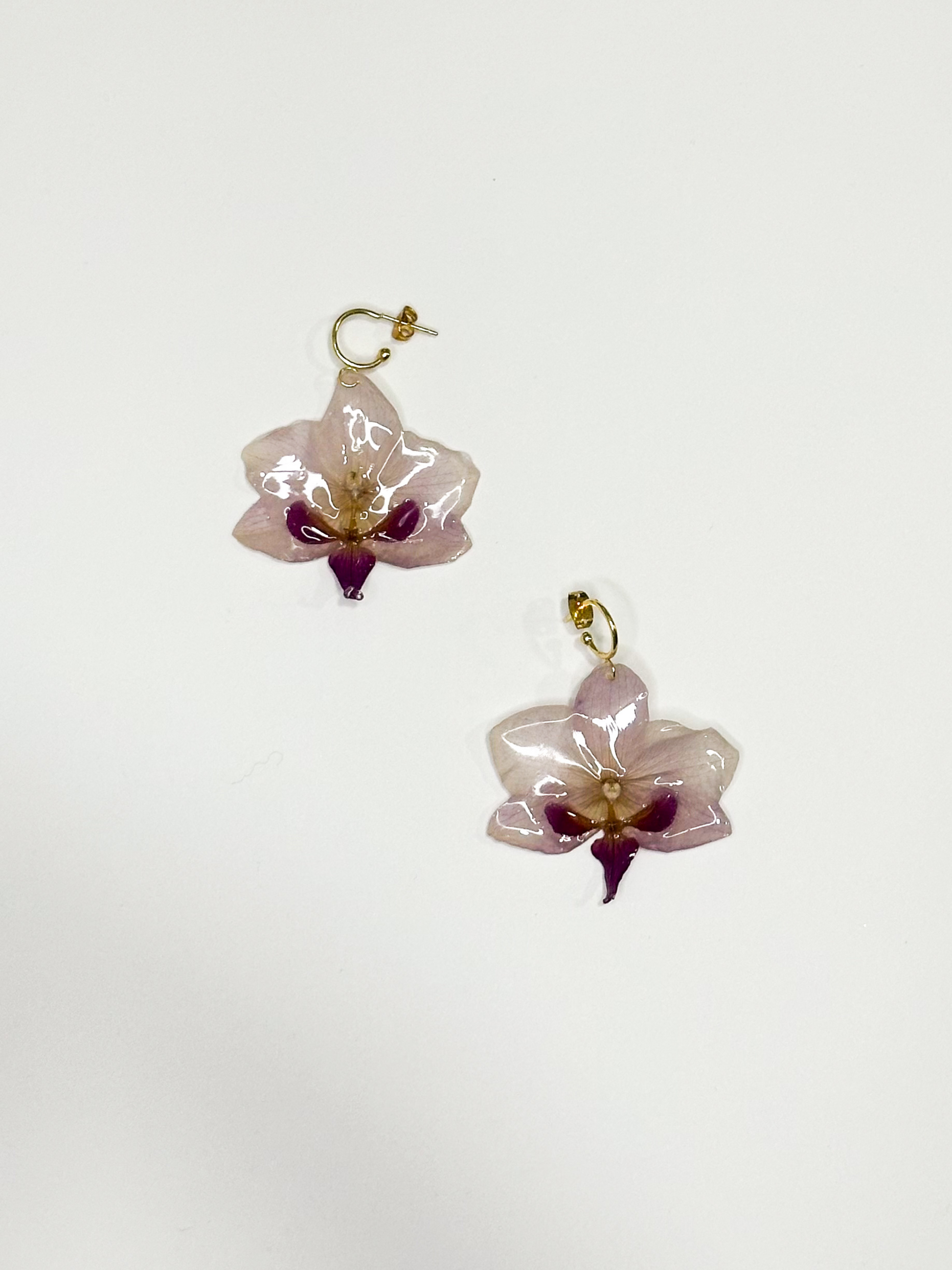 Stainless steel earring with dehydrated orchids wrapped in resin.