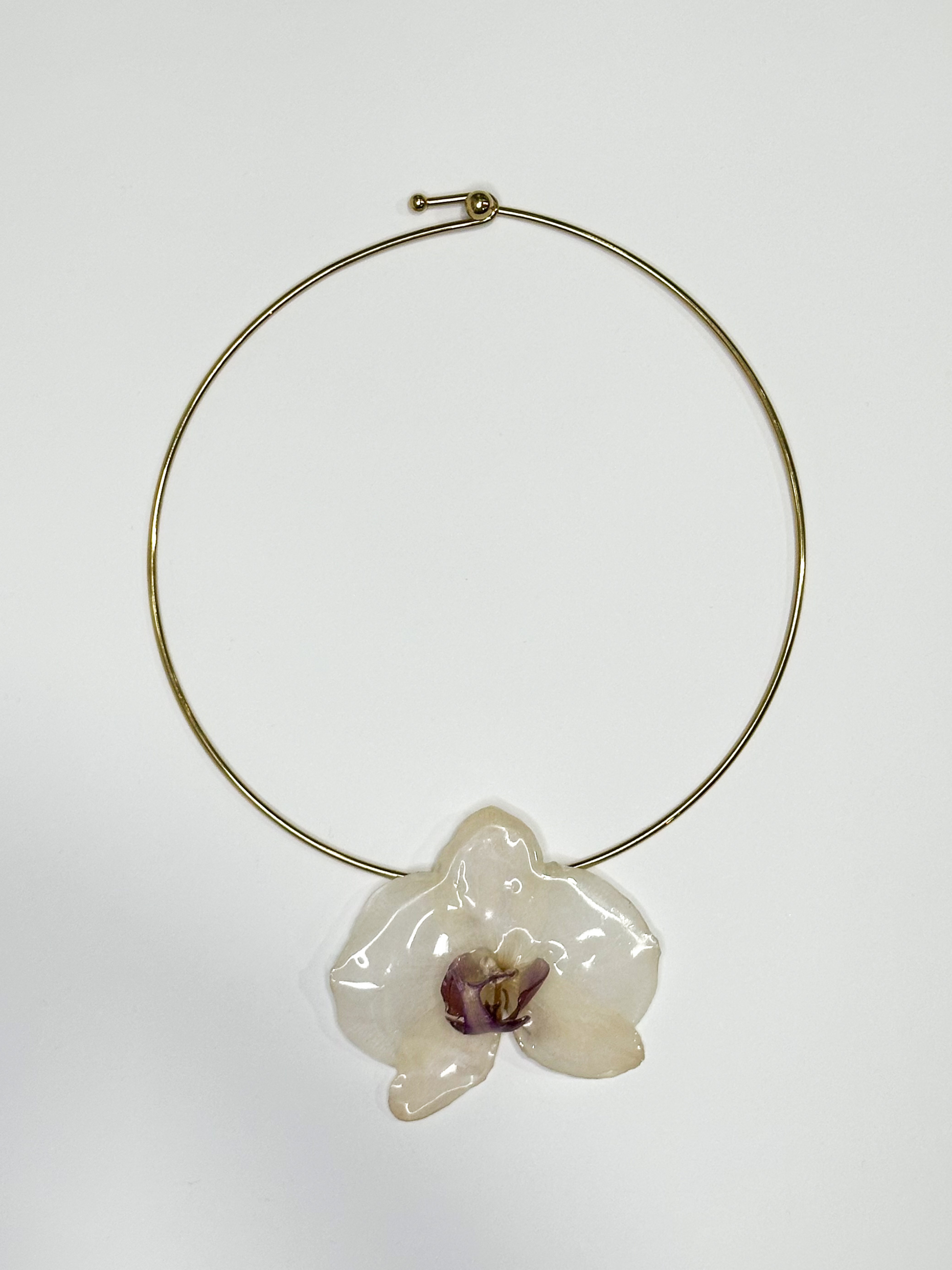 Chocker em aço inoxidável com pendente de Orquídea Branca desidratada envolvida em resina.